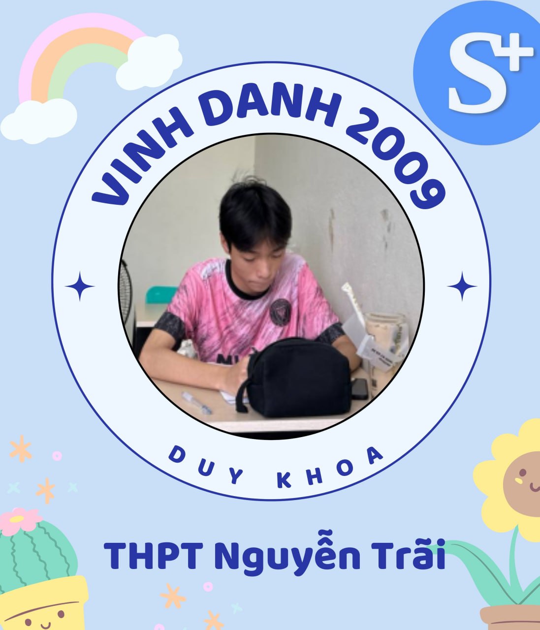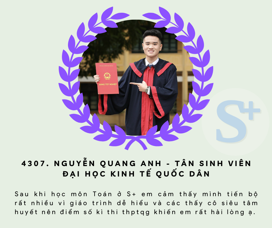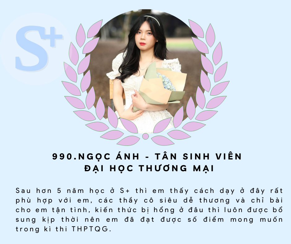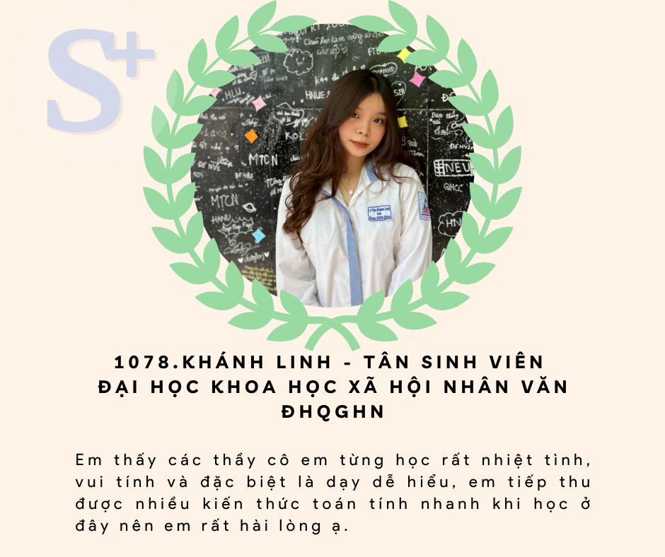 Em học tại S+ 3 năm rồi. Từ lúc học ở đây, sức học của em cứ tăng lên từ từ, riêng lớp 12 em thấy mình học tốt hơn lớp 11 gấp 2-4 lần. Em thích cách học tại S+ vì em được tự học. Mọi người đều thân thiện. Đặc biệt thầy cô dạy hay, dễ hiểu và vui nữa ạ.