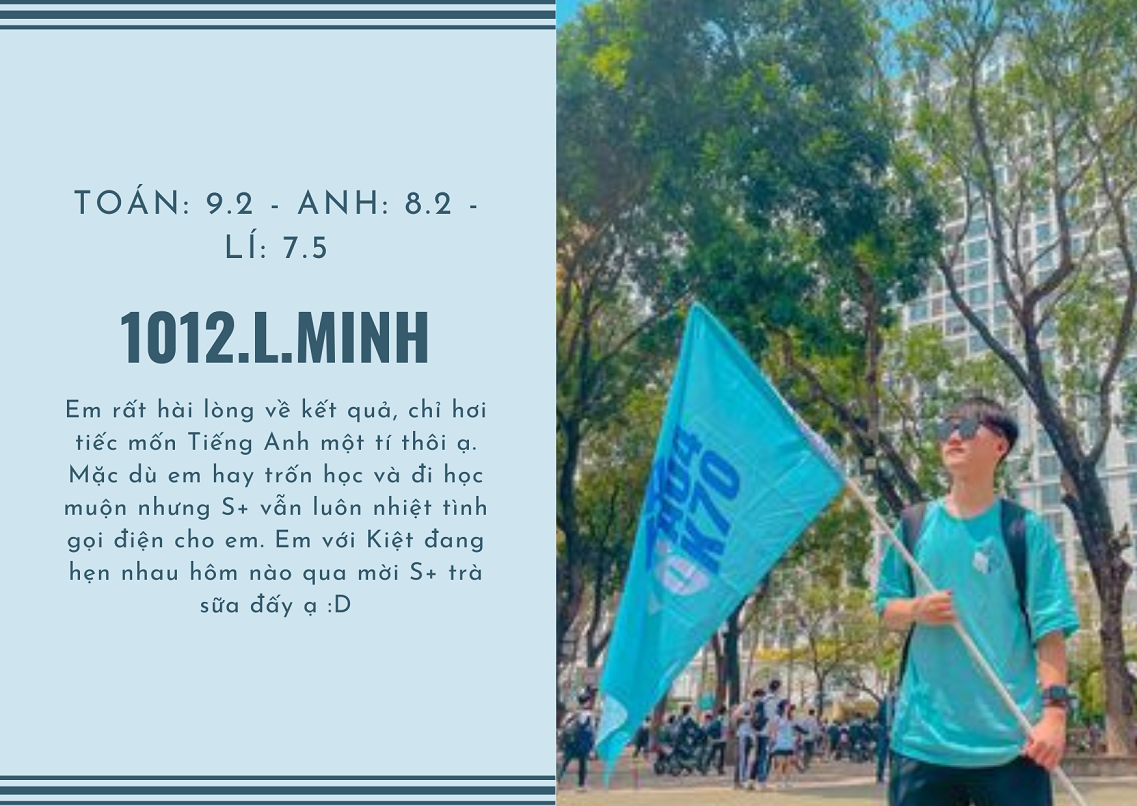 Em học ở S+ từ năm lớp 10 . Học ở trung tâm rất vui ạ. Em học lí, hóa tại đây, em rất quý các thầy cô vì các thầy cô dạy vui ạ. Em học dốt lắm nên mới phải đi học á. Trung tâm có kẹo rất ngon nữa ạ. Được đi học ở S+ là em vui ạ.