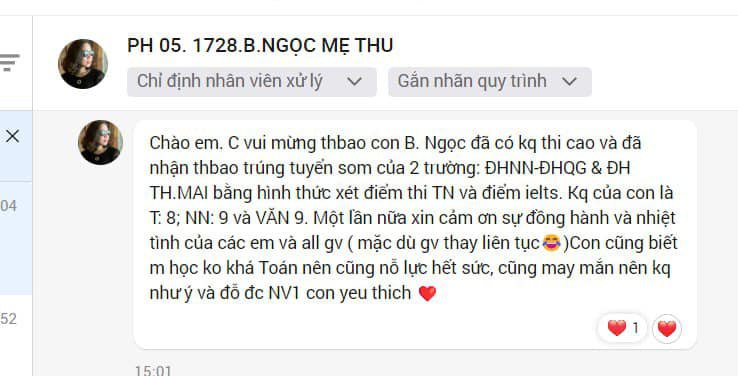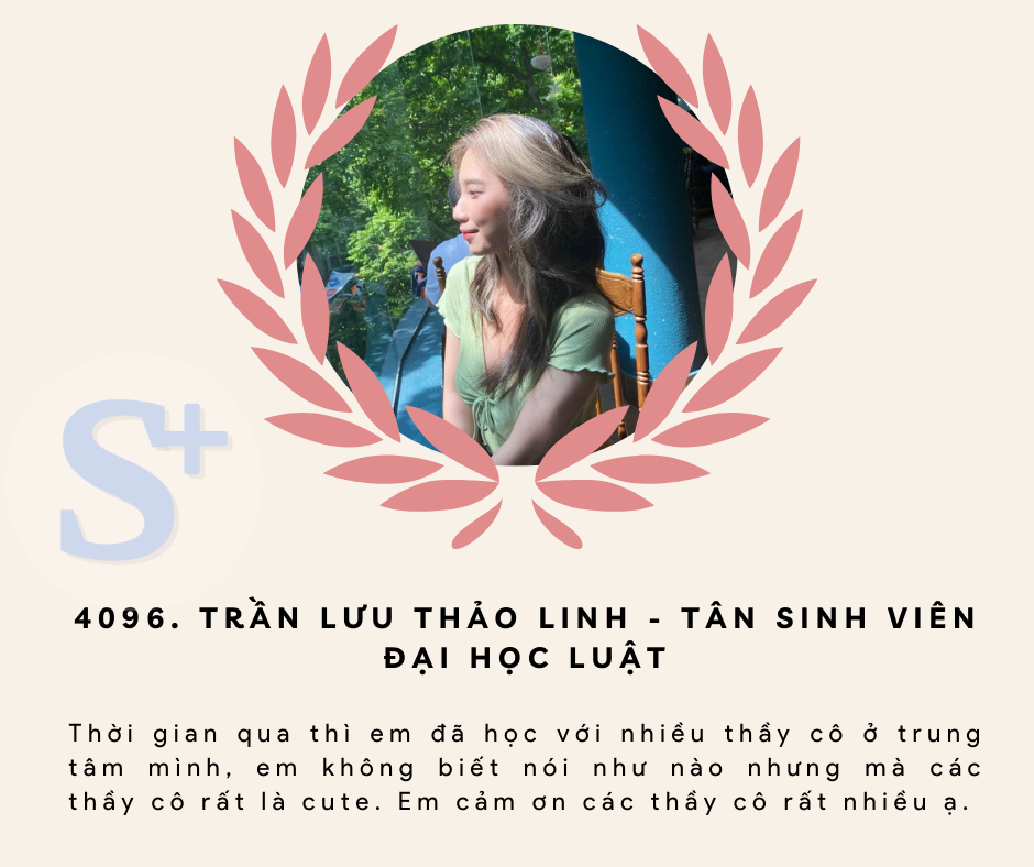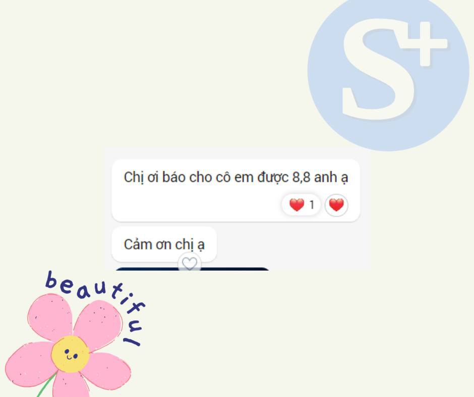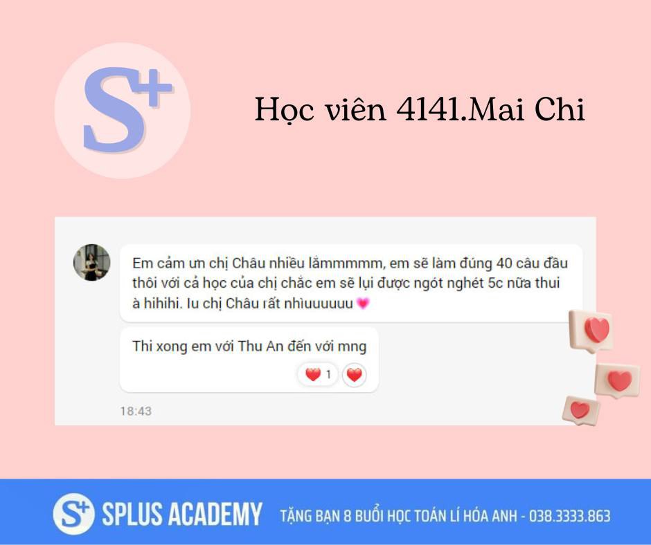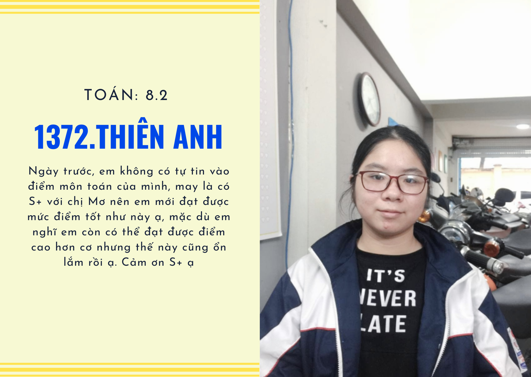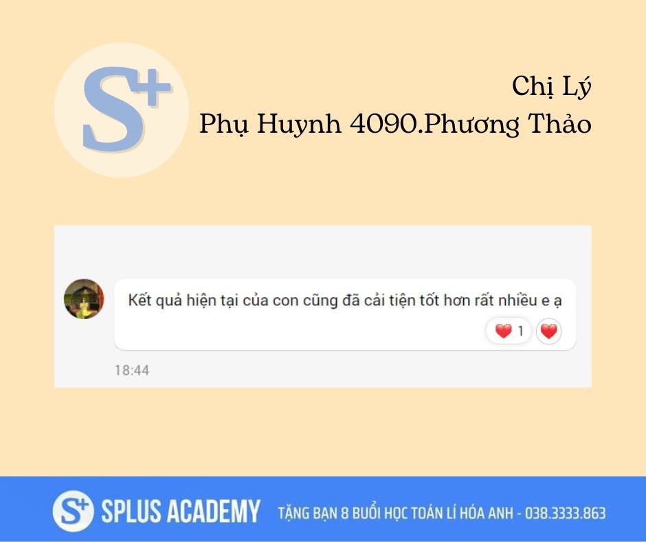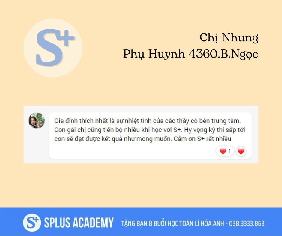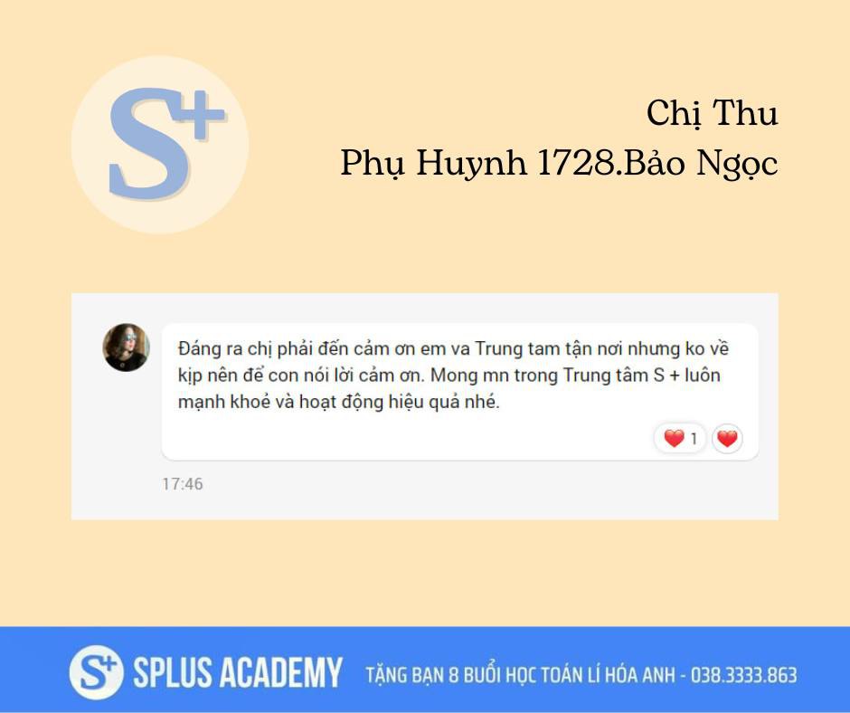 Em học thêm ở S+ từ lớp 7, em thấy giáo viên S+ rất nhiệt tình, giúp em tiếp thu kiến thức dễ dàng và có tiến bộ. S+ giúp em thấy việc học “dễ thở” hơn. Các chị Tư vấn viên còn tâm lý, hay trò chuyện với em ngoài giờ học. Nhiều hoạt động ở S+ cũng giúp em hòa đồng hơn.