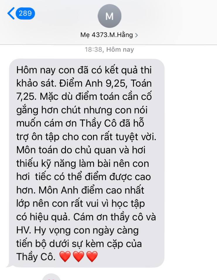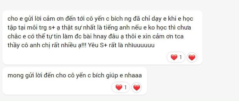Giáo viên dạy Anh ở S+ thân thiện lắm, em thấy dễ tiếp thu bài học. Không hiểu bài có thể hỏi cô giáo thoải mái mà không sợ ảnh hưởng đến bạn khác. Ở S+ em thấy vui vẻ, tự nhiên như ở nhà. Học một thời gian em thấy tiến bộ hơn nhiều.