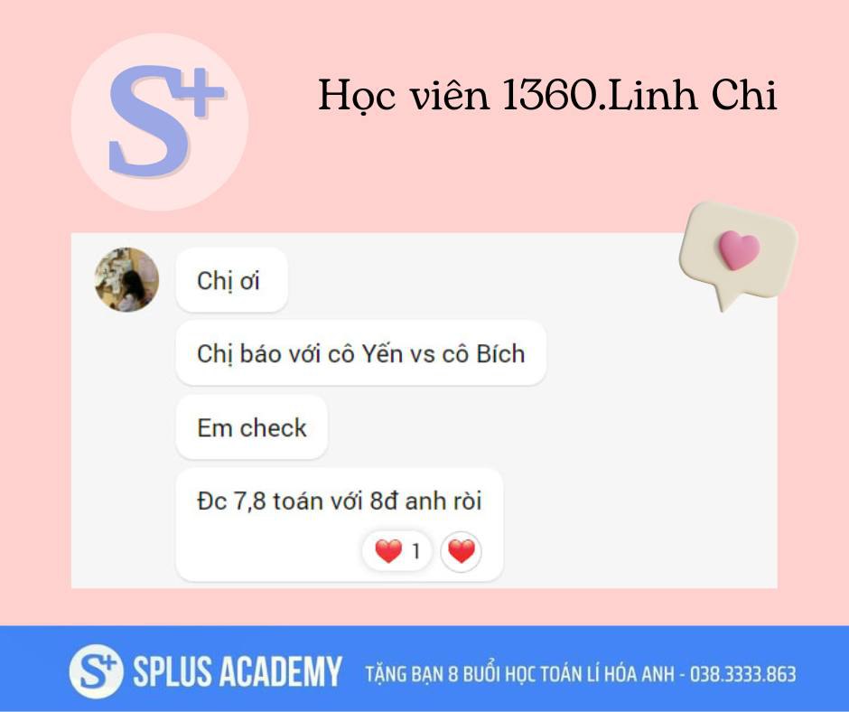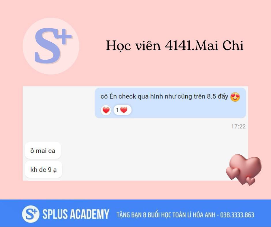 Em mới học tại S+ môn Hóa, Toán. Em học thấy hiệu quả, điểm số cải thiện rõ rệt. Mỗi bạn 1 tốc độ học riêng, bài tập riêng, tự lập trong quá trình học. Vì mỗi bạn một chương trình nên sẽ không sợ chậm kiến thức và hiểu rõ bài hơn.