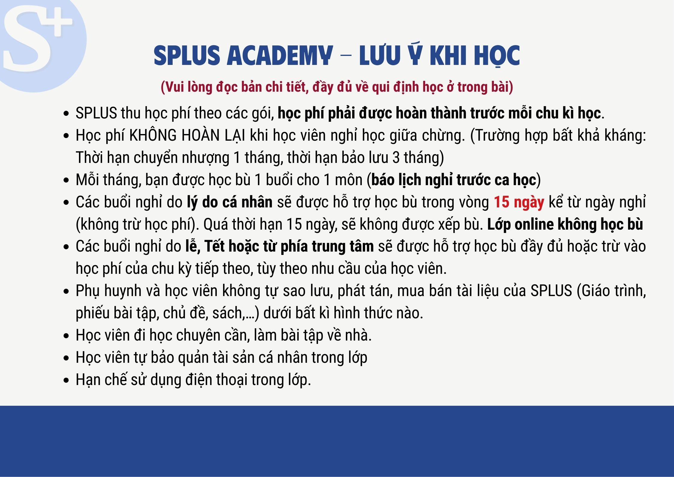 - SPLUS không bảo lưu và hoàn lại học phí khi học viên nghỉ giữa chừng.